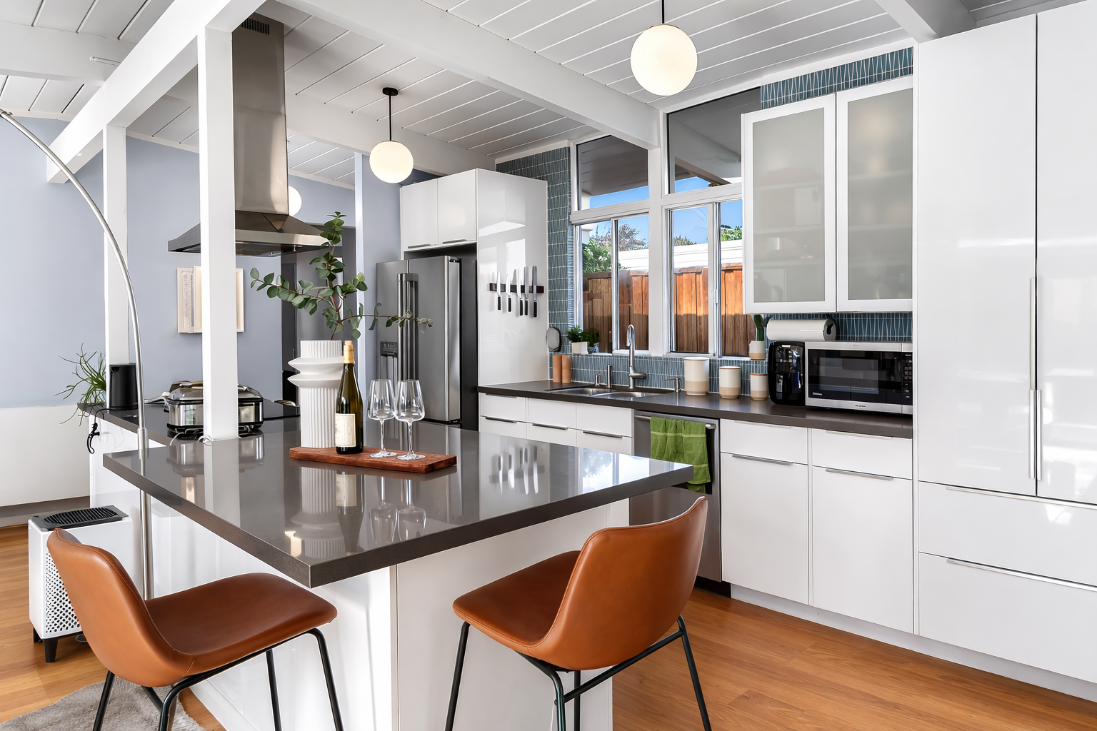 The home reflects the timeless hallmarks that make mid century modern homes and Eichler-inspired architecture so coveted: post-and-beam construction, expansive walls of glass, and an intentional connection between interior living spaces and the surrounding landscape. The open floor plan, soaring vaulted wood ceilings, and effortless indoor-outdoor flow create an atmosphere that feels both architecturally pure and exceptionally livable. Natural light becomes a design element in itself, moving through the space throughout the day and highlighting the clean geometry, warm materials, and modern simplicity that define California modernist homes.